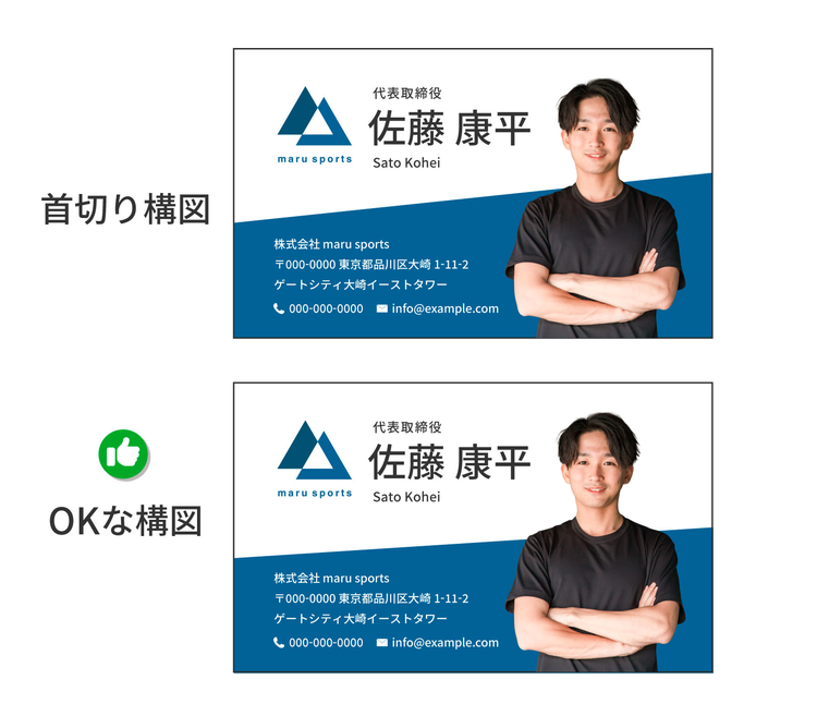 もちろん自信や力強さを伝えるには効果的ですが、やわらかさや親しみを出したい場合には、顔まわりの表情を活かした構図を選ぶのもおすすめですよ。
