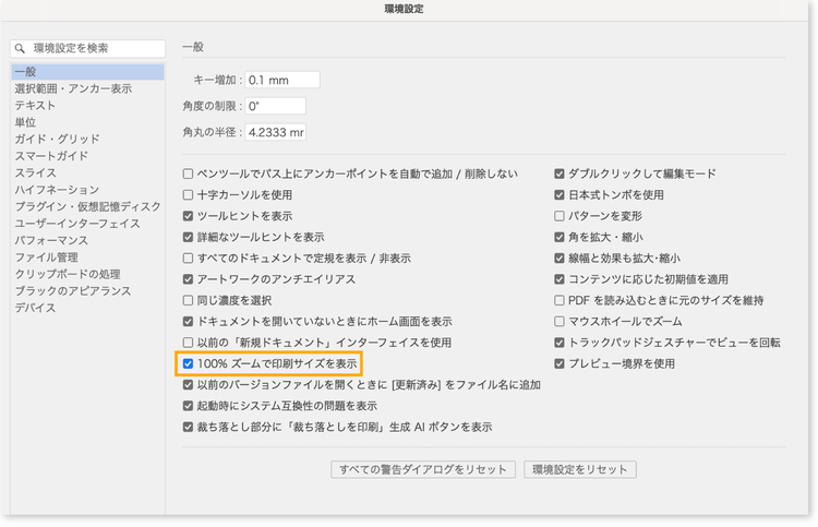 デフォルトでチェックはついていますが、この項目にチェックを入れておくと、100%表示時にモニタ上でも「印刷物とほぼ同じ大きさ」で確認できるようになるんです。