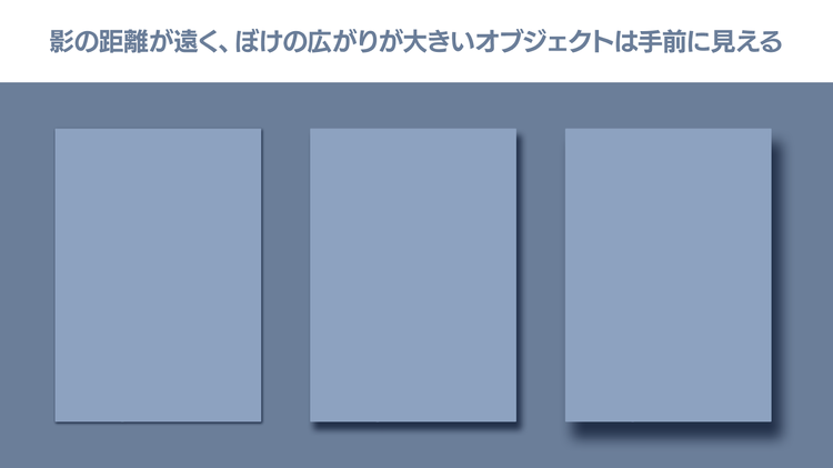 同じポスターでも、影がオブジェクトのすぐ近くにあれば「地面や背景に接している(低い)」と感じ、影が離れていてぼかしが大きいほど「背景から大きく浮いている(高い)」と感じます。