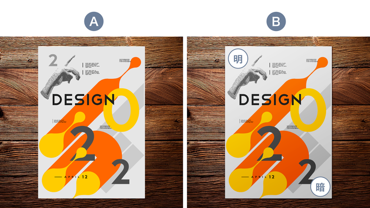今回の作例では、Aのポスターには影がなく、Bのポスターにはわずかにぼかした薄い影が付いています。