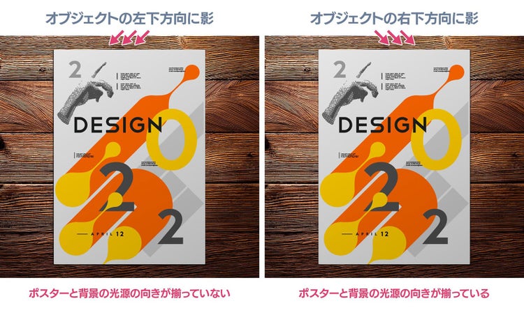 しかし、ポスターの影の向きを左下に設定してしまうと、背景とポスターで光源の向きが揃わなくなるため、不自然な合成に見えてしまいます。