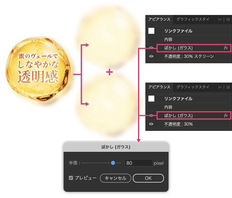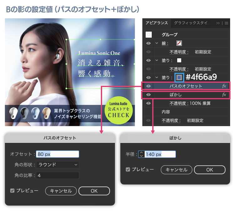 「パスのオフセット」で文字を広げ、「ぼかし」で文字をぼかすことで、擬似的にドロップシャドウのような表現となり、背景に自然に馴染む影を作れます。