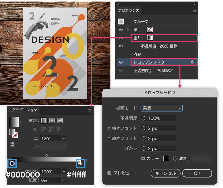 AではIllustratorの「ドロップシャドウ」という機能を使い、距離の短い影を作っています。