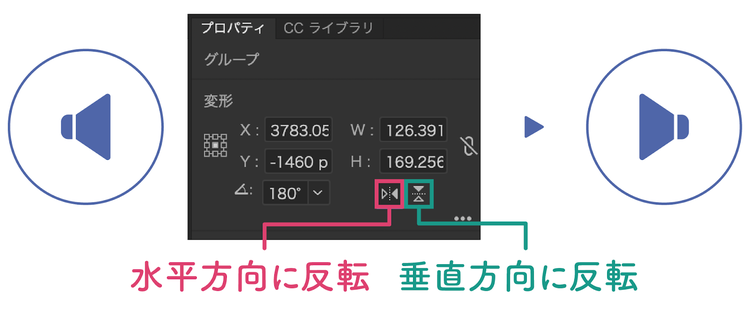 Illustratorでアイコンを反転させる場合、ドラッグによる手動操作ではなく、プロパティパネルの「水平方向に反転」または「垂直方向に反転」ボタンを使用するのがオススメです。