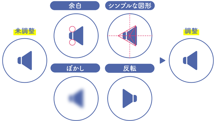 サウンドアイコンなら「三角形」として捉え、その三角形の重心(各頂点から対辺の中点に引いた線の交点)を円の中心に合わせるように配置すると、バランスが整います。