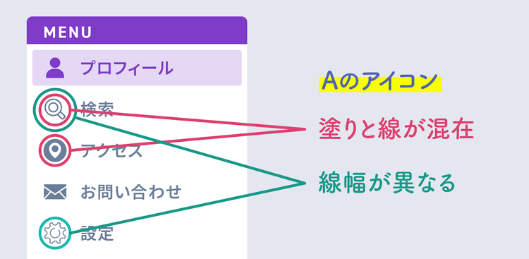 まずは「塗り」と「線」、どちらかのスタイルに統一し、そのうえで線の太さや角の丸みを数値レベルで揃えるよう意識しましょう。