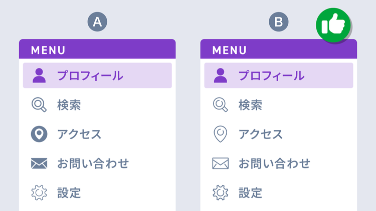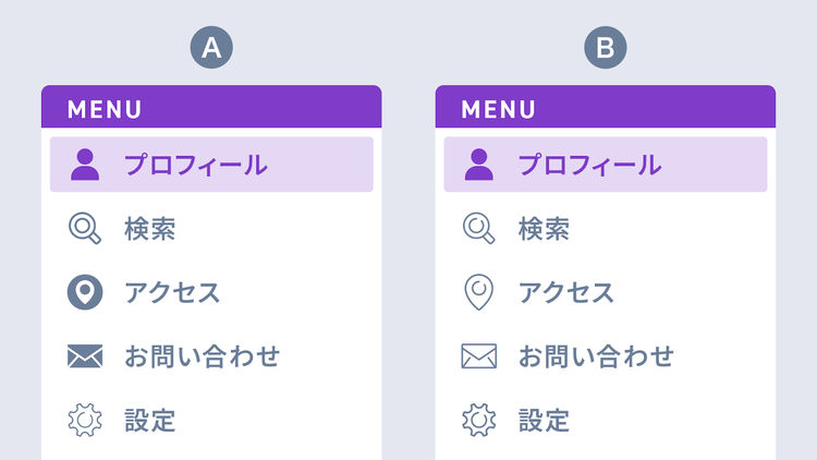 ただし、今回の作例Bのように、「線」アイコンを基本とし、アクティブなメニューにだけあえてスタイルを変えて「塗り」アイコンにするといった変化はOKです。
