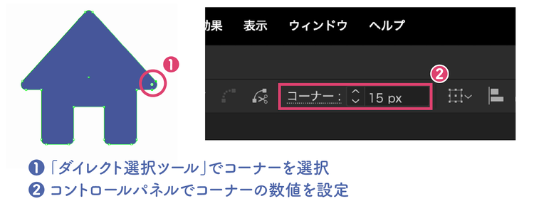 Illustratorでは「ダイレクト選択ツール」で角を選び、コントロールパネルの「コーナー」から角丸の数値を設定できます。