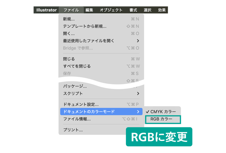 そんなときは、「ファイル」>「ドキュメントのカラーモード」>「CMYKカラー」をクリックします。