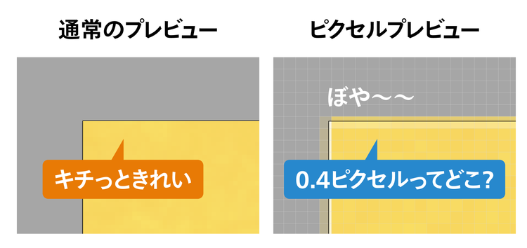 ※Retinaや4Kディスプレイなどの環境では、ピクセルプレビューと書き出しファイルに差が出ることもあります。そのため、ピクセルプレビューはあくまで参考程度にし、実際に書き出されたファイルでもしっかりと確認してくださいね。