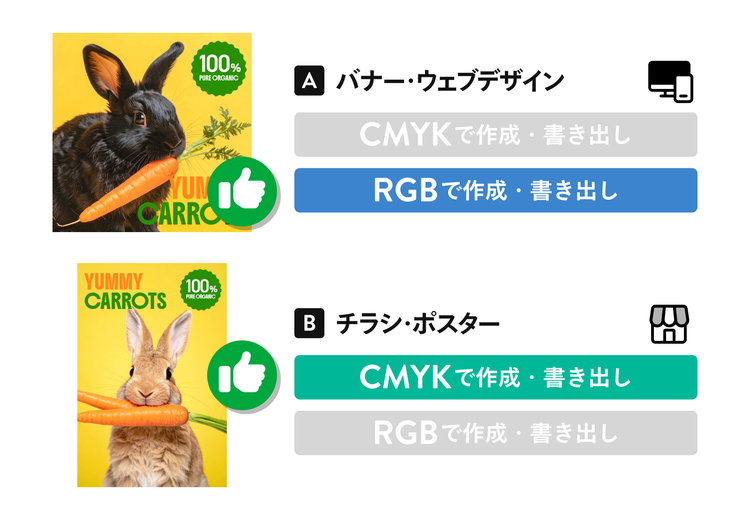 A(ウェブ)とB(紙媒体)、それぞれのシーンに適した正しいカラーモードを選択してください。