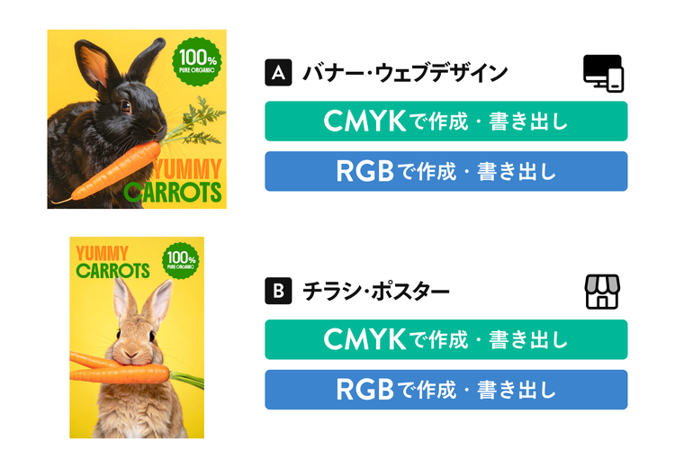 作例Aのようなバナーやウェブデザインには「RGB」を、Bのようなチラシやポスターには「CMYK」を使うのが正解です。