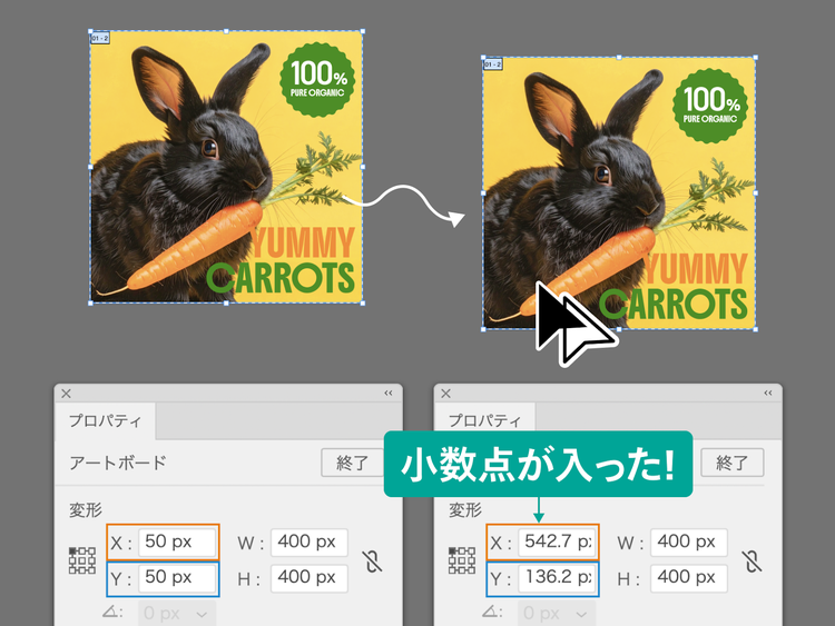 また、アートボードの作成時はもちろん、書き出し前に「プロパティ」パネルの「アートボードを編集」から、X、Y、W、Hの各数値に小数点がないかの確認を習慣化しましょう。