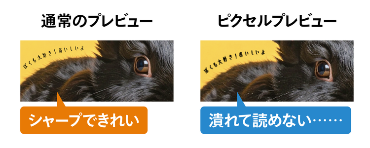 事前にピクセルプレビューを使用して、ぼやけや文字潰れが発生していないか確認しましょう。