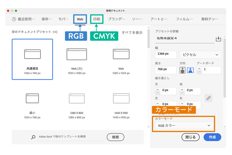 このとき、「Web」タブを選ぶと自動で「RGB」に、「印刷」タブを選ぶと「CMYK」に設定されるので、まずは制作物の利用シーンに合わせてタブを選択しましょう。