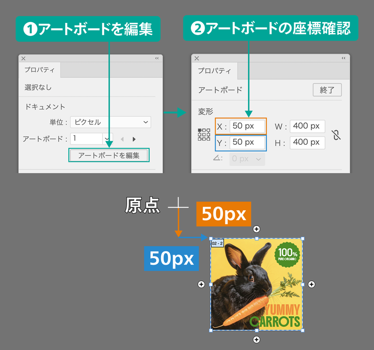 例えば、「X:50px」「Y:50px」となっていた場合、原点から縦に50px、横に50px行ったところにアートボードがある、ということです。