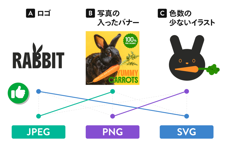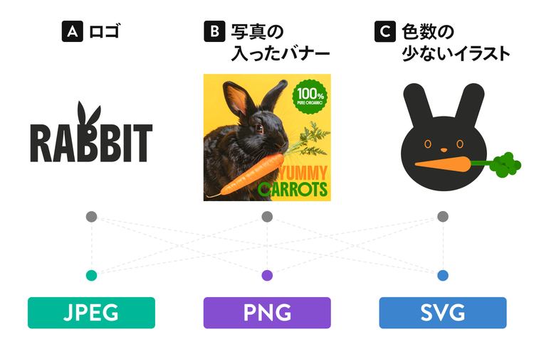 ロゴ、写真の入ったバナー、色数の少ないイラスト、それぞれの特徴から最適なファイル形式を見付けられたでしょうか。