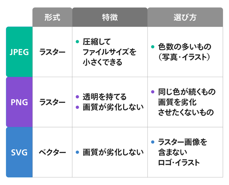 - JPEG、PNG、SVGなどのファイル形式の特徴を知り、デザインに含まれる要素や条件で選ぶ