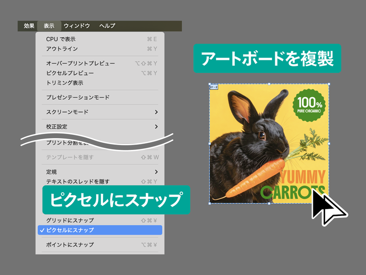 - Illustratorで作成したデザインをラスター形式で書き出す場合は「ピクセルプレビュー」で確認する