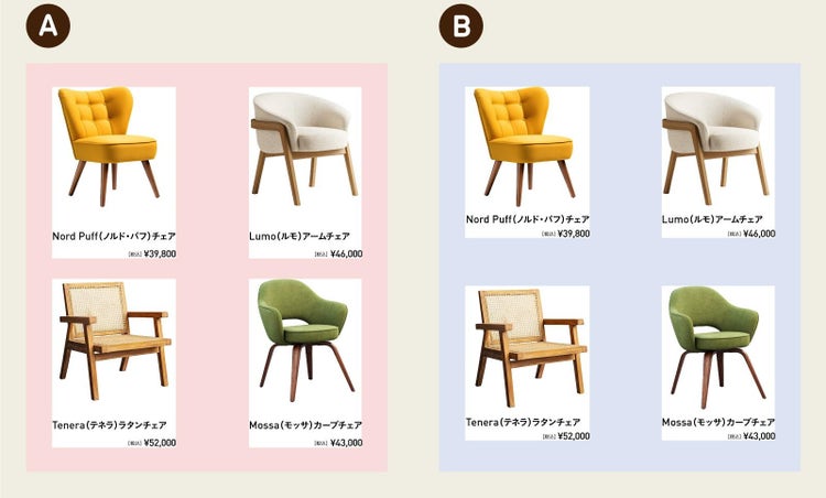 一方、Bのレイアウトでは、商品写真のすぐ下に商品名・価格が配置されています。