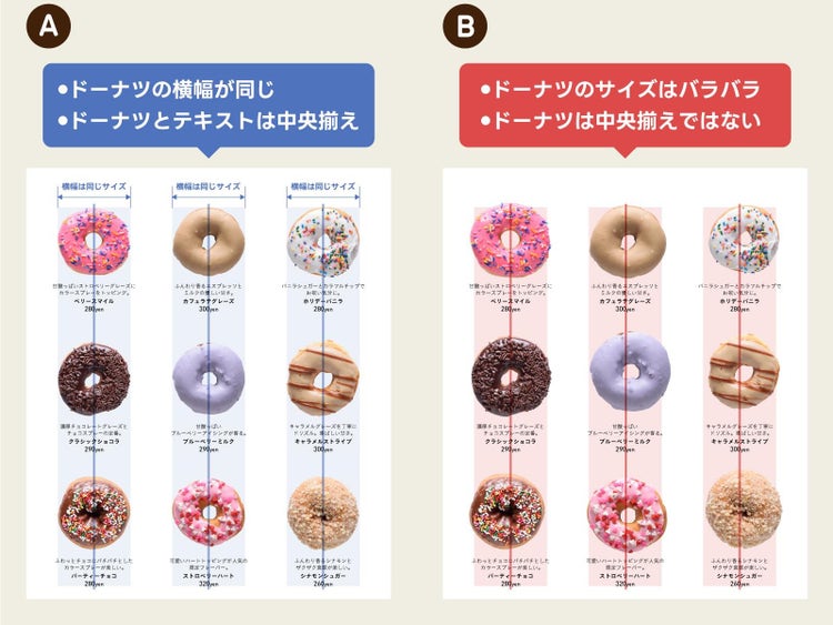 一方、Bのレイアウトでは、ドーナツの大きさがバラバラで、中央軸から左右にズレて配置されてしまっています。