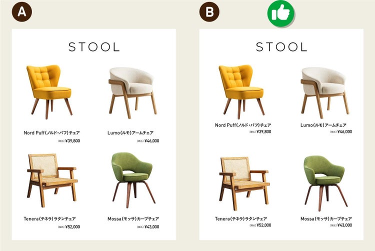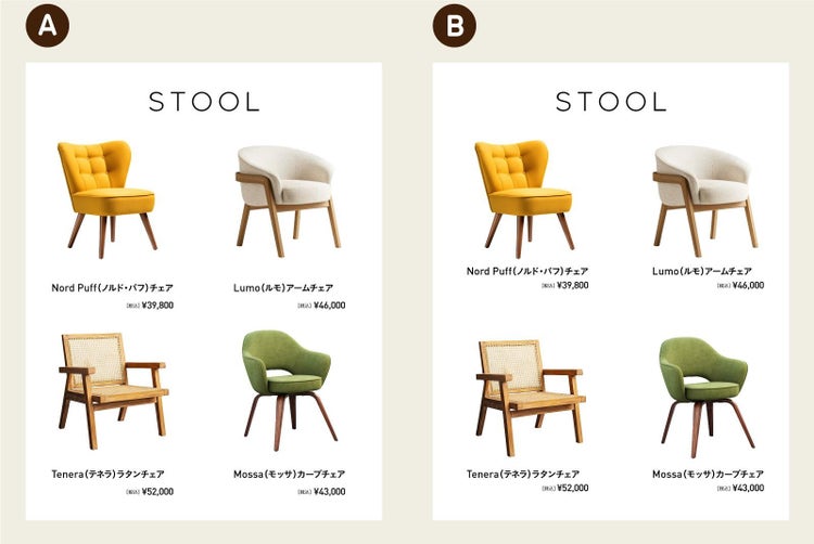 椅子のカタログ、パッと見て情報を把握しやすいのはどっち?