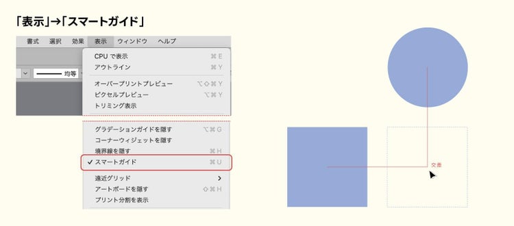 表示メニューの「スマートガイド」を使うと、、オブジェクトを動かす際に自動で基準線が表示されます。