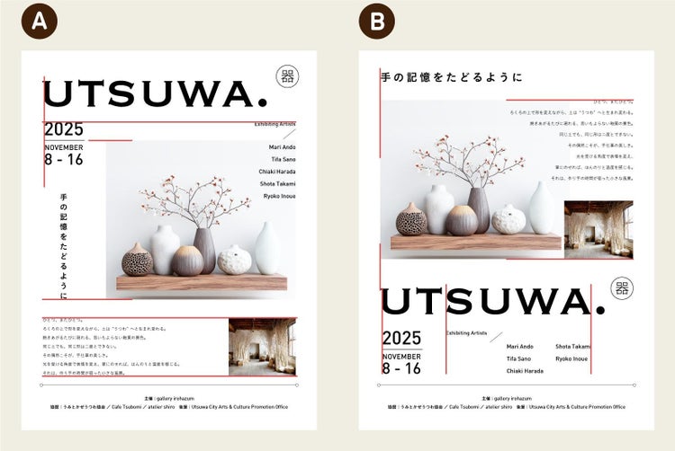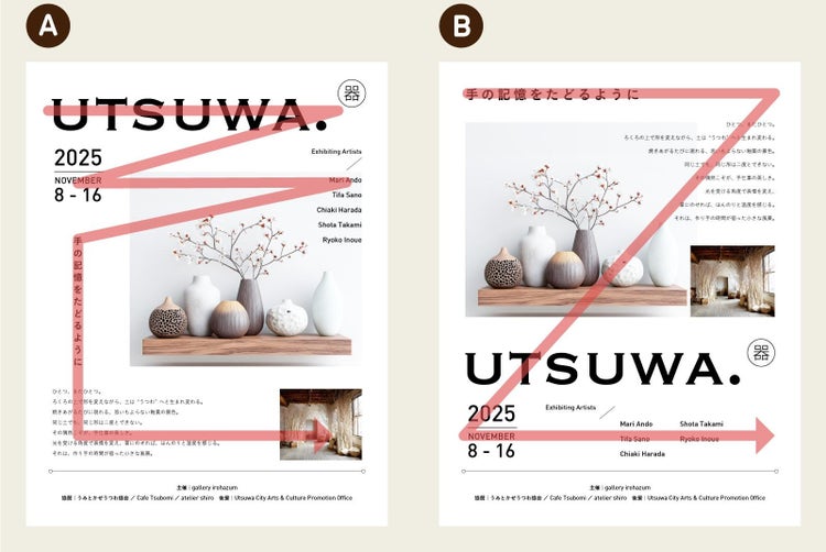 例えば、重要な情報である展覧会名が左上に配置されている点は、視線の入りとして理にかなっています。