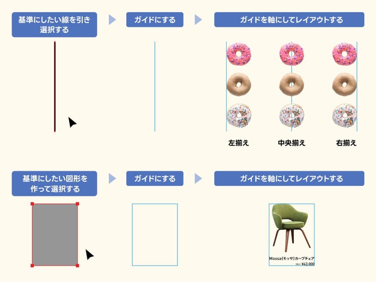 テキストや図形、写真などを配置するときは「見えない基準線」を用いて、「どの要素をどの位置に揃えるか」を決めます。