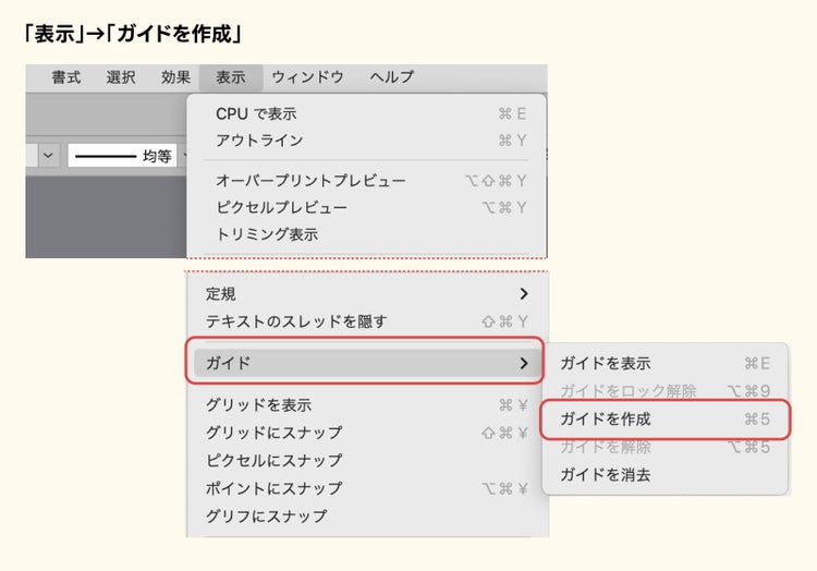 まず、線や図形などのオブジェクトを選択した状態で、表示メニューの「ガイド」から「ガイドを作成」を選択します。
