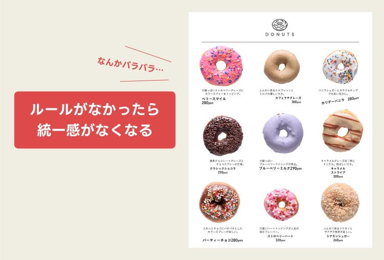 ルールとは、中央揃え・左揃え・右揃えなどの位置だけでなく、サイズ(大きさ)や間隔など、いろいろな要素を指します。