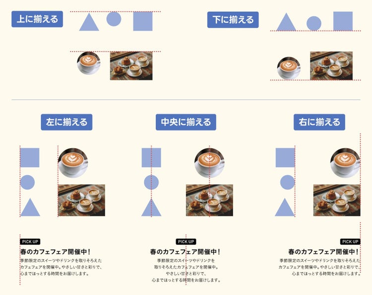 「整列」は、テキストや写真などの要素を見えない線に沿って配置する考え方です。