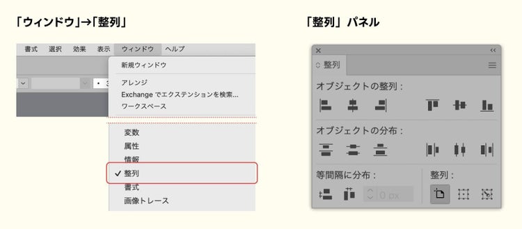 ウィンドウメニューにある「整列」から開ける整列パネルを使うと、オブジェクト同士を正確に中央・左・右などに揃えられます。