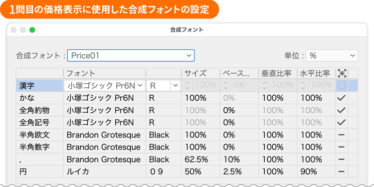 作例で使用した価格表示用の合成フォントは次のように設定しました。