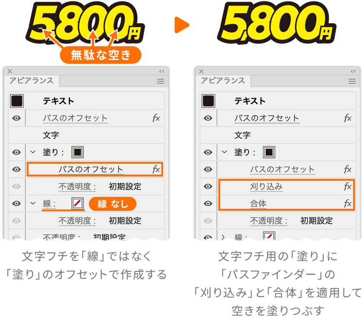 - アピアランスパネルの「塗り」に「効果メニュー」→「パスのオフセット」を設定して文字のフチを作成する