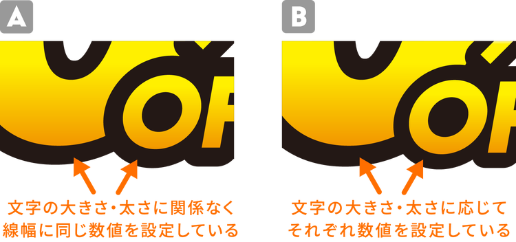 一方Bは、文字の大きさや太さに合わせて、線幅を変えています。