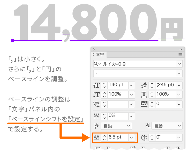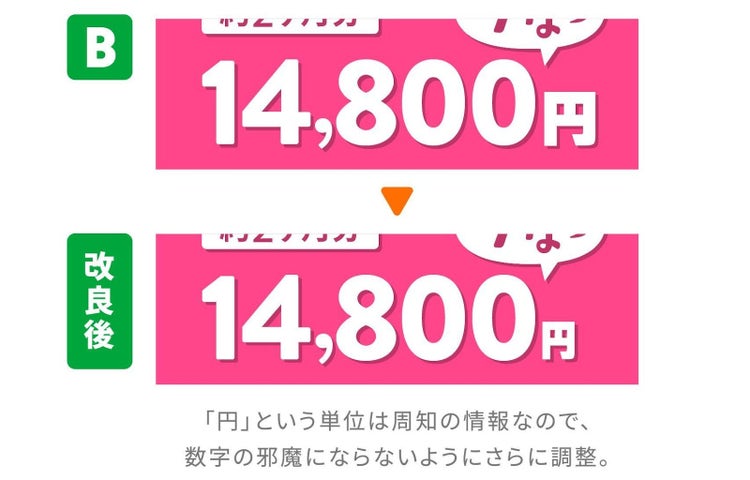 一方Bは、カンマを小さくしたうえで上下位置を調整し、「円」という漢字も少し上にあげています。