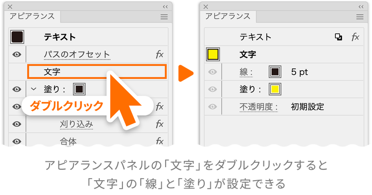 まず、テキストのオブジェクトを選択し、アピアランスパネルを開きます。