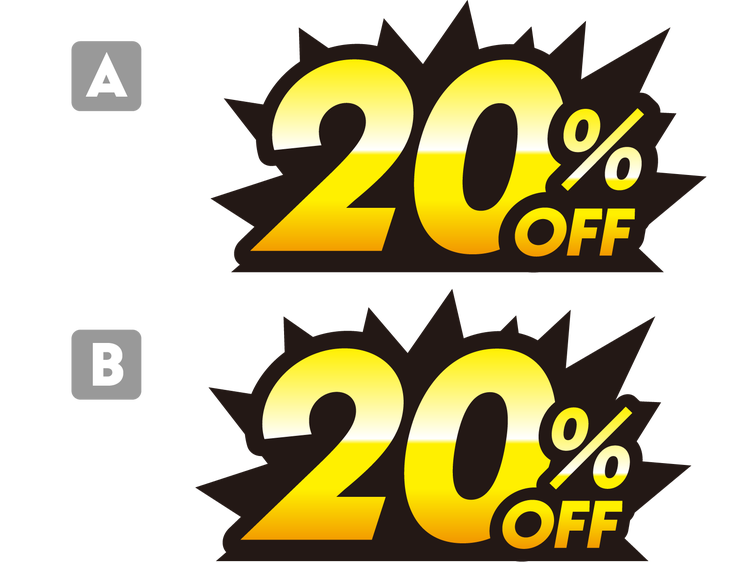 以下は、ふたつの作例の背面に配置しているトゲトゲ(これをチラシ系の現場では「バクダン」と呼びます)を非表示にし、表示を拡大したものがこちらです。
