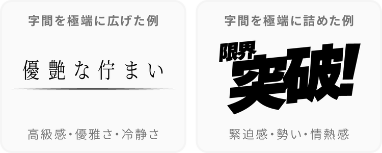 しかしあえて、タイトルやキャッチフレーズなどの文字列では、字間を極端に調整することで、高級感や緊迫感を演出する場合もあります。