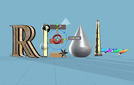 Dimensionには、よく利用されるモデルやマテリアル、ライトなどがあらかじめ用意されており、配置しマテリアルの設定を行うだけで簡単に3Dシーンを作成することができます。