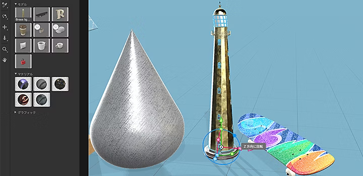また、3Dアプリケーションから書き出した3Dデータを読み込む、Adobe Stockから追加の3Dモデルを追加する、AdobeIllustratorやAdobe Photoshopで制作したグラフィックを3Dモデルにデカールとして配置する、Substanceで作成したマテリアル素材を読み込むといった連携も行えるように設計されています。