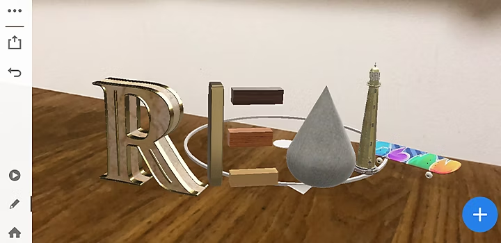 DimensionからAero用に書き出すと、iOS向けに提供されているARプラットフォーム・Adobe Aero上で現実空間の上に3DCGをミックスした拡張現実として投影することができるようになります。