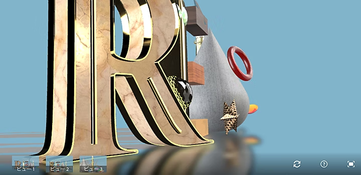 図は作成した3DシーンをWebブラウザで表示したものです。静止画ではなく3Dのため、カメラ位置を動かすことでさまざまな角度から見ることができます。