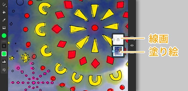 塗り絵データは「線画」「塗り絵」のレイヤーに分かれているので、「塗り絵」用のレイヤーに色をつけていきましょう。「線画」は保護されているので、どんなに塗りを重ねても、線が消えてしまうことはありません。