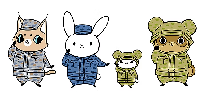 4コマまんが「どうぶつ自衛隊」(漫画:フカキショウコ)より/カラカル隊員、うさぎ隊員、チュー隊長、たぬき隊員