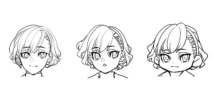 デフォルメキャラの顔はどのように描けばよいでしょうか。絵柄にもよりますが、ミニキャラやちびキャラ、SDキャラの可愛さを出すには、頭身の数値が低くなるのに合わせ、丸みを強くし、線はシンプルにしていきましょう。