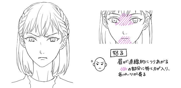 怒った顔を描く時に、一番のポイントとなるのは眉です。怒った顔の場合は、眉間の筋肉に力が入った結果、眉間にシワが寄り、眉頭が下がります。
