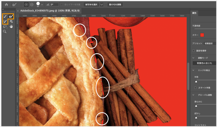 表示モード内の「表示」から「オーバーレイ」を選ぶと、選択範囲をチェックしやすくなります。すると、アップルパイと下に敷かれているクロスの境界線といった細かい部分が欠けていることがわかります。