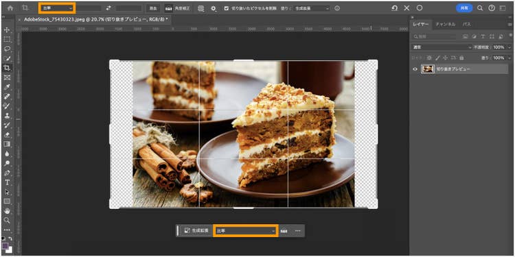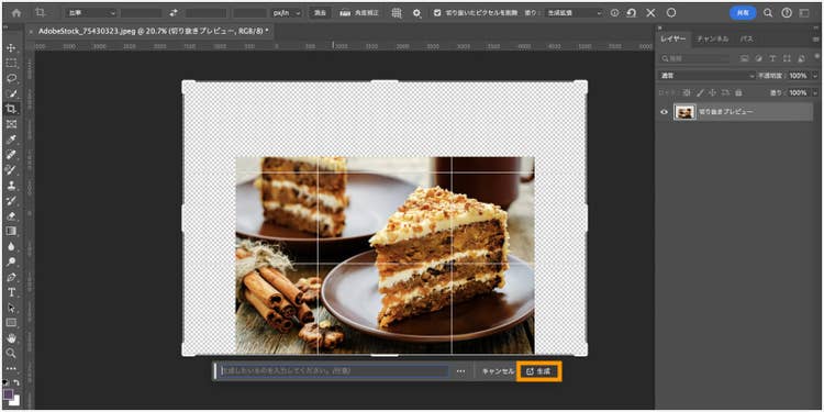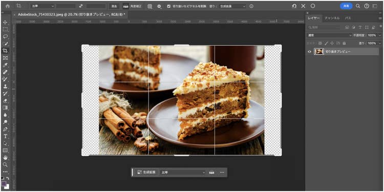 「生成拡張」は、最新の生成AI技術「Adobe Firefly Image Model」を活用し、背景の不足部分を高精度で推測して拡張してくれる機能です。